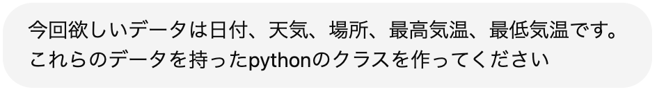 このプロンプトで基本的なコードを書いてもらって、今回必要なデータを伝えてそのデータのクラスを作ってもらう