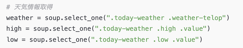 コードを見てみるとBeautifulSoupのselect_one()メソッドの引数に入れるCSSセレクターが悪そう。