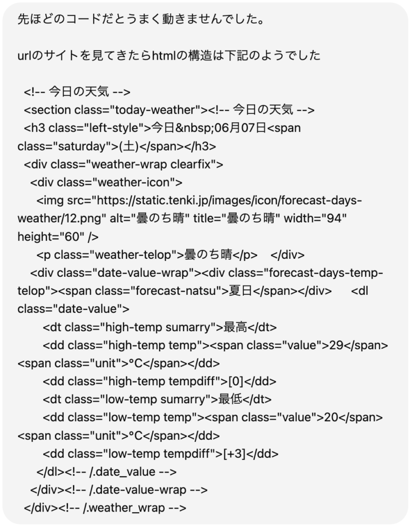 今回取得して欲しい情報がある部分のHTMLを教えてコードを修正してもらう。