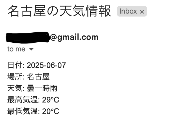 usecase = SendTodayWeatherToMail(weather_repository=NagoyaWeatherRepository(), sender=GmailSender())