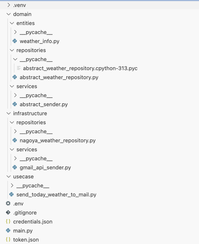 最終的にはDDD的な感じでusecase、infrastracture、domainに分けてmain.pyではusecaseのインスタンス作成&メソッドの実行をするだけにした。